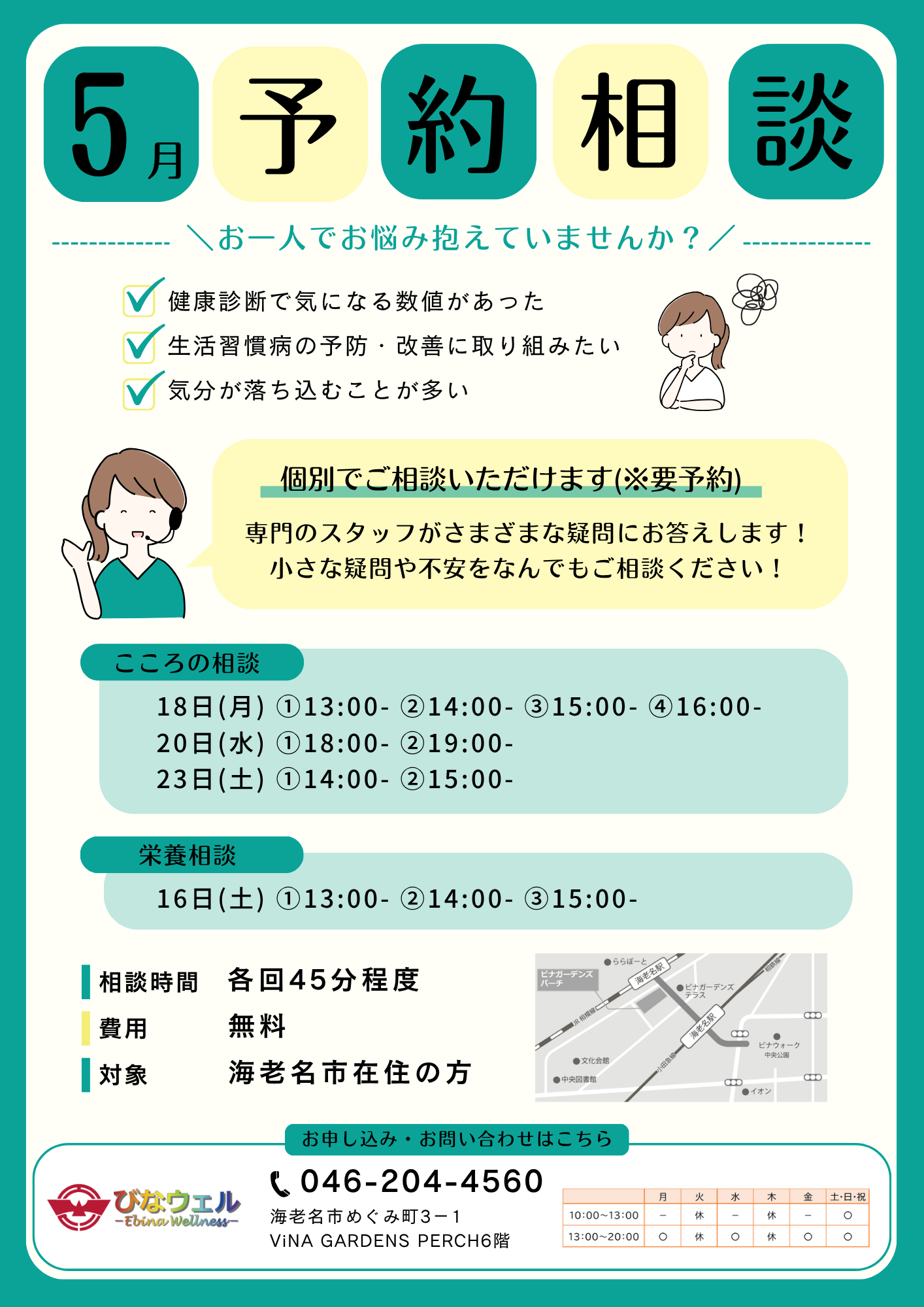 健康相談ご希望の方は、直接電話にてご予約ください。
